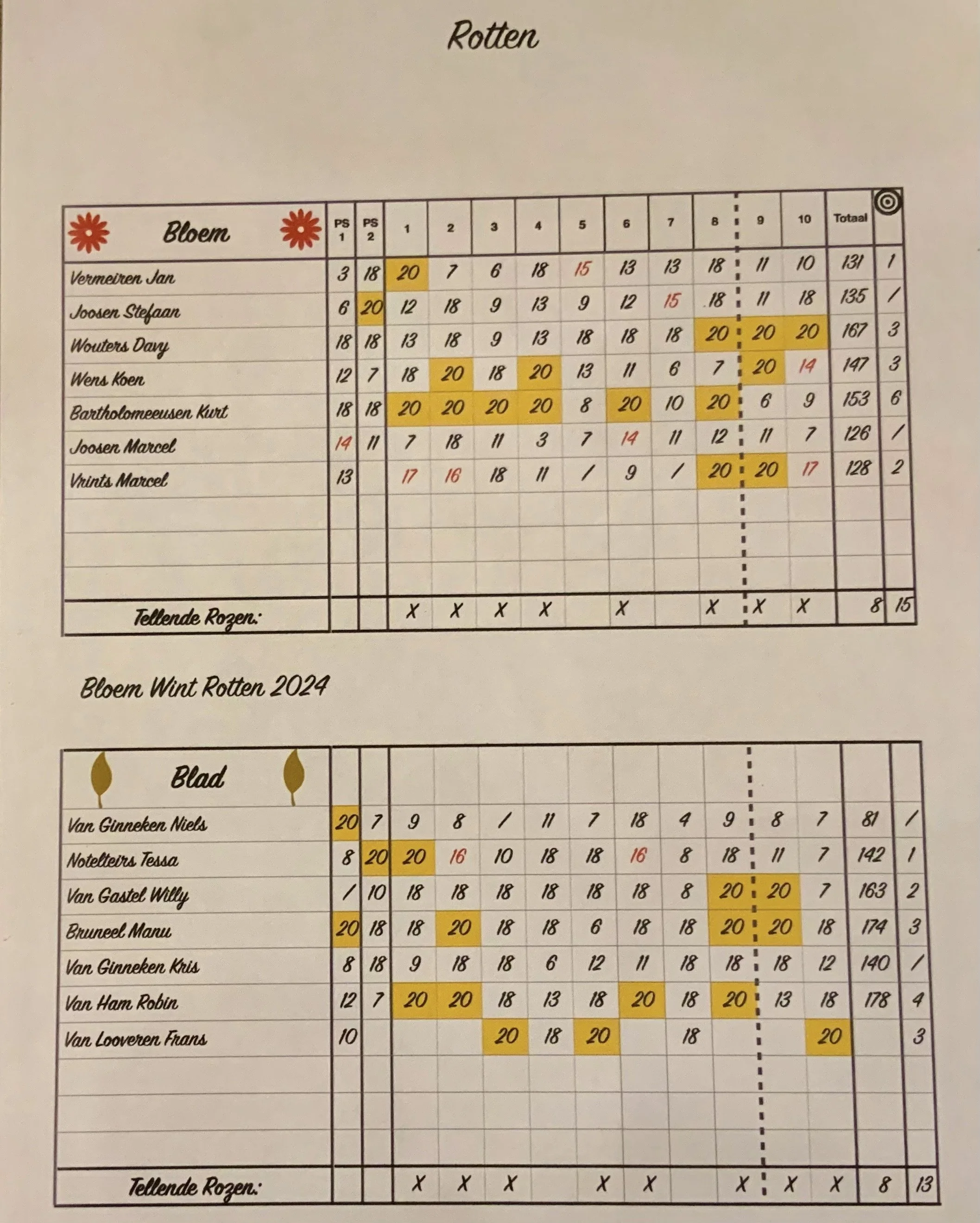 -Blad ( de 7 pijlen die iets verder belandden): Niels van Ginneken, Tessa Notelteirs, Willy van Gastel, Manu Bruneel, Kris van Ginneken, Robin van Ham, Frans van Looveren.