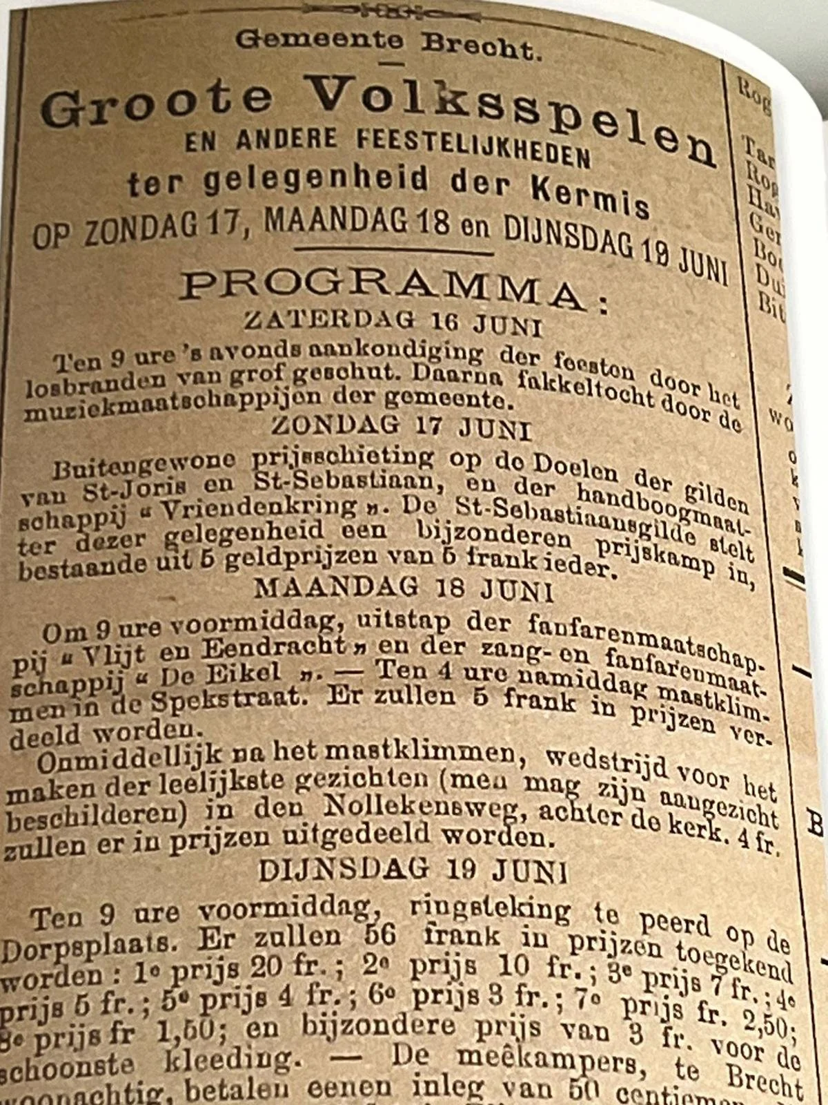 Ook op sociaal vlak en bij feestelijkheden deden de gilden reeds van oudsher hun duit in het zakje…zo ook bij ons in Brecht! Zo vinden we in “Voetspoor 2” een affiche over “Groote Volksspelen” ter gelegenheid der Kermis in Brecht op zondag 17, maandag 18 en dinsdag 19 juni 1894. Op het programma van zondag 17 juni 1894 prijkt: Buitengewone prijsschieting op de Doelen der gilden van Sint-Joris en Sint-Sebastiaan….