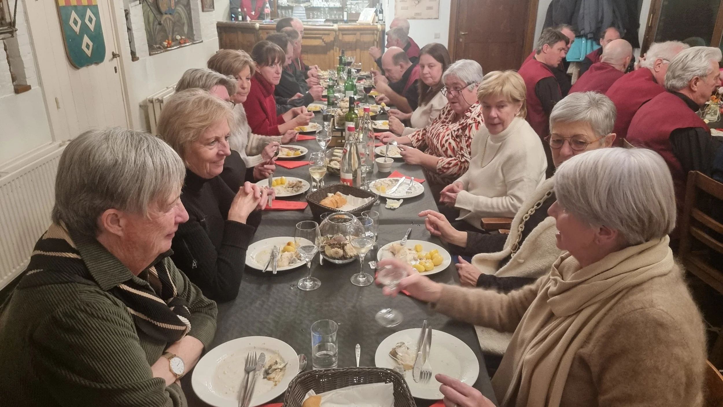 Ze serveerden een heerlijke erwtensoep op “grootmoeders wijze”, dit wil zeggen gecombineerd met oren en poten! Ze ging er goed in, de meesten namen nog een tweede portie. Een poos nadien was het kabeljauw met heerlijke gekookte patatjes en een botersaus, tot ieders smaak!