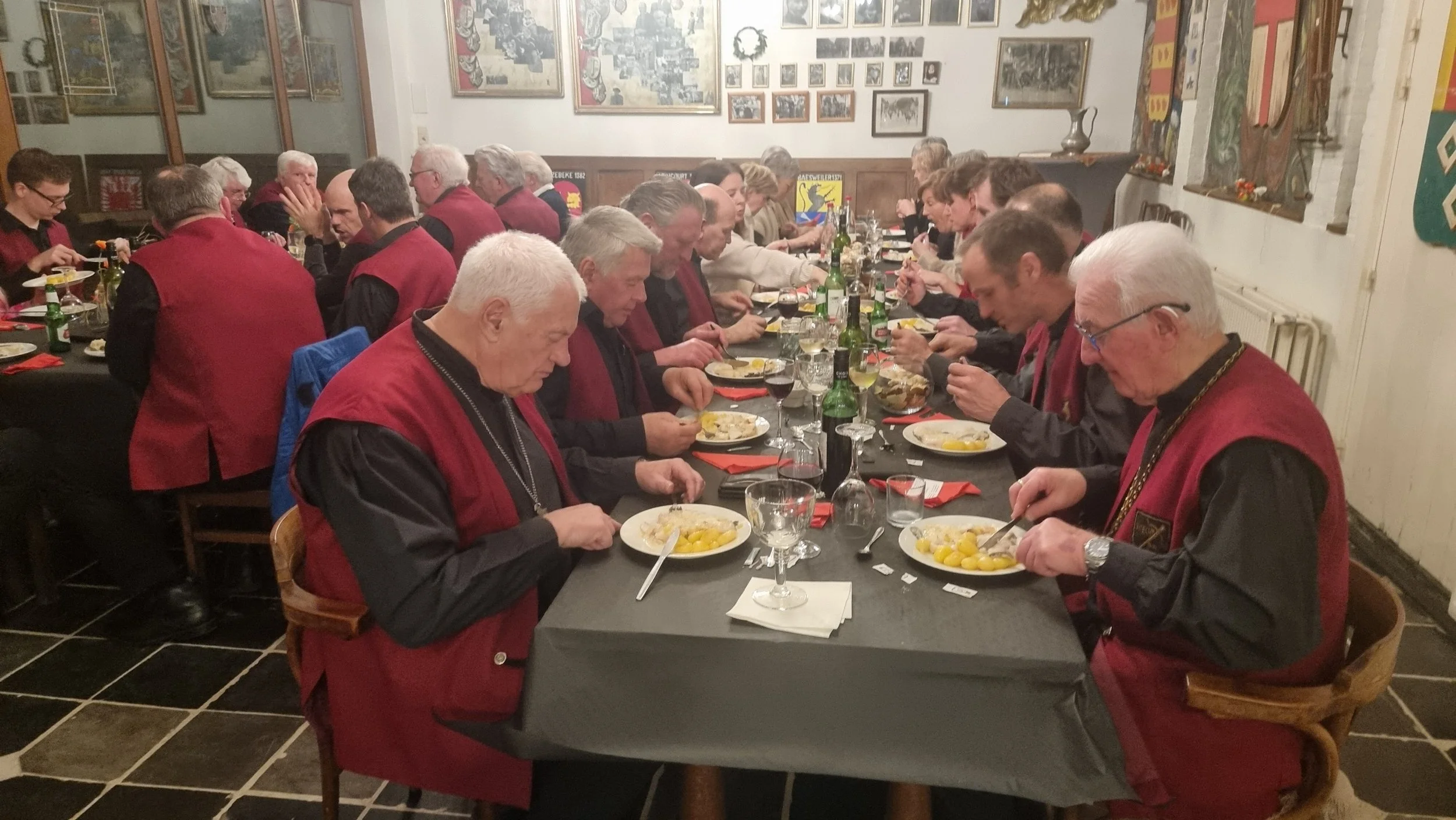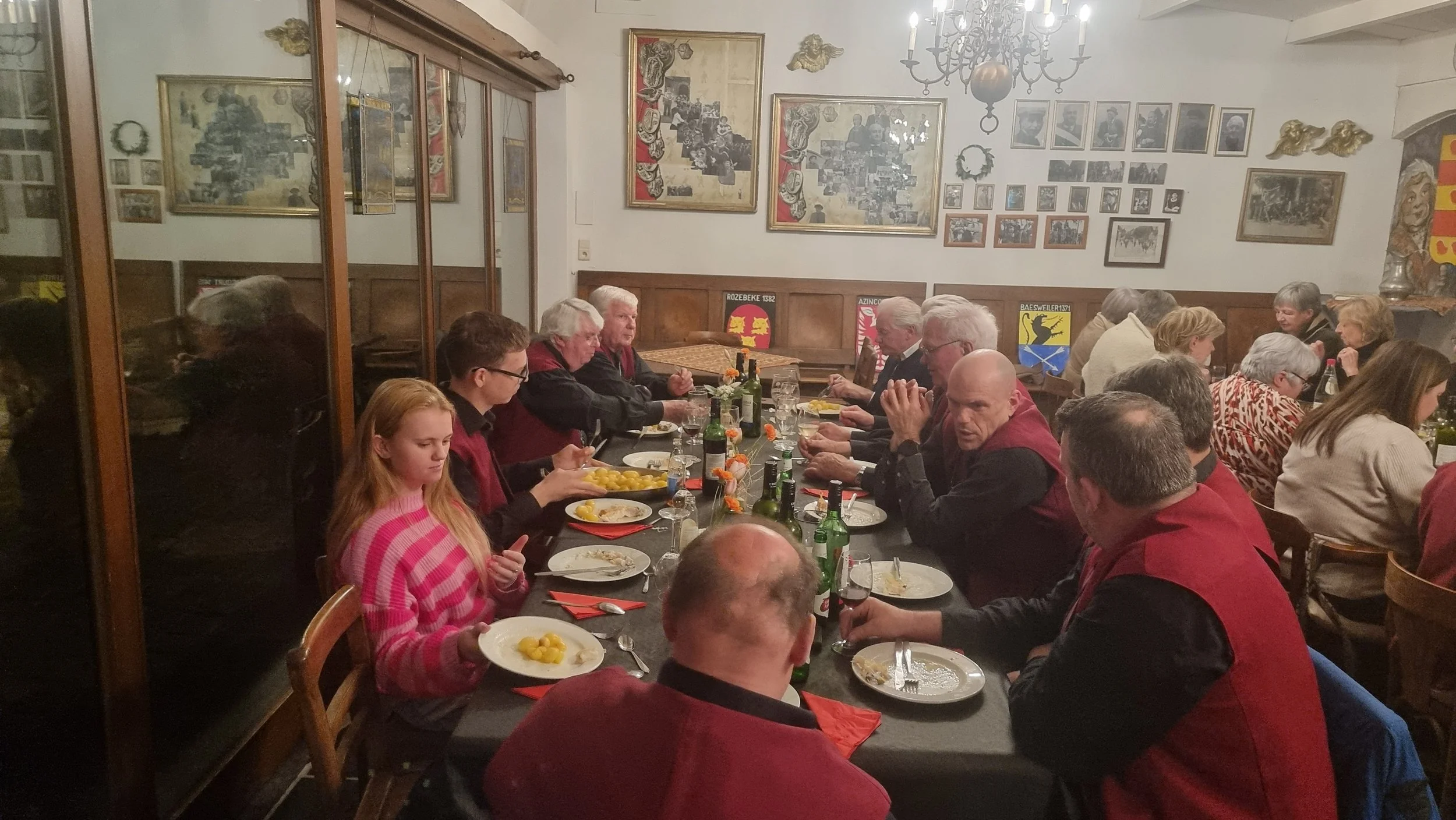 Om 19u verzamelden zich 20 gildebroeders en 11 gildezusters in het gildecafé. De gildebroeders in gildekledij zoals het bij een officiële feest past. Na hartelijke begroetingen, het nuttigen van een fris pintje, Brechtse pale ale of andere frisdrank, ontbood Hoofdman Achiel van Ballaert iedereen aan tafel.